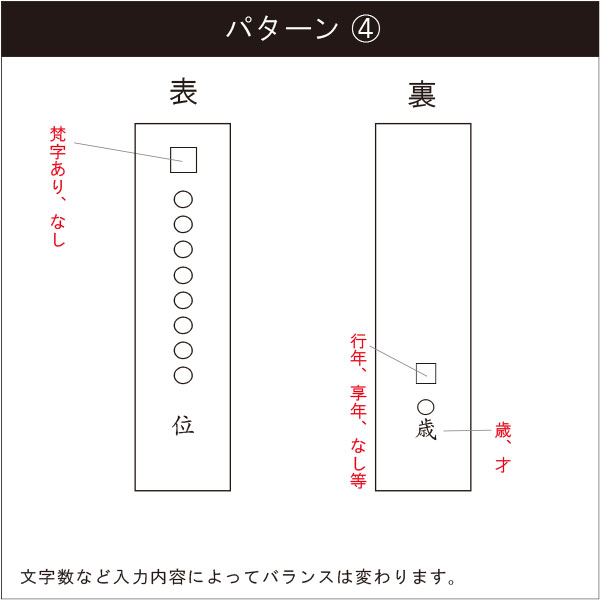 | 商品説明 | 【商品番号:3297】 お位牌本体ではありません。 必ずお位牌と一緒にご注文ください。 一度彫った文字は修正ができませんので、必ず下記をよく読んで文字の名入れをお知らせください。 【ご用意いただくもの】 戒名、没年月日、俗名(故人のお名前)、没年齢(故人の年齢)が分かる「白木位牌」「戒名用紙」を写真に撮ってご注文後メールにてお送りください。 メールはタイトルを「彫文字用、戒名・白木位牌写真」として、「注文者のお名前」「お電話番号」「今回ご購入の商品名」をご記入ください。 メールドレス sales@nihondou.co.jp 【オプション選択にて以下の内容をご入力ください】 ●ご希望納期 ●法要日 ●宗派 ●お位牌に入れる文字 戒名・法名 俗名(故人のお名前) 没年齢(故人の年齢) 没年月日 ●文字の色/表面 色、裏面 色 ●ご希望のレイアウトのパターン 【納期について】 納期は、お客様に彫文字の原稿確認をして頂き、文字確認原稿確定後「メーカー営業日の約2週間後の発送」となります。原稿の確認にもお時間を要します。余裕をもってご注文ください。 【原稿について】 基本的に弊社では「白木位牌」や「戒名用紙」に沿って原稿を作製致します。 故人の年齢の行年・享年の入れ方や戒名の下に「位」を入れるなど、先祖位牌に合わせて白木位牌より変更する場合があります。 また、以下のご説明では一般的な文字入れを記しておりますが、あくまでも一例です。どの文字を入れる・入れないというご指定は「お客様やご住職の判断」となります。事前に菩提寺やご住職にご相談の上、お入れする文字をご確認ください。 (弊社で作成した原稿を、菩提寺やご住職にご確認いただくと確実かと存じます) 【文字入れについて】 機械彫は札板に機械で文字を彫り、そこに金を箔押しします。 しっかりと彫られているため経年劣化が少なく、文字の美しさが長持ちします。 【お位牌にお入れする文字】 ■戒名・法名 先代のお位牌に合わせるなど、戒名の下に「位」や「霊位」などを付ける場合は、ご入力の際に「位」や「霊位」までご入力ください。 ・真言宗は、一般的には大日如来を示す梵字の「ア」字を記入してます。 ・白木位牌に入っている「新帰元」「帰元」「新円寂」などの文字は一般的に本位牌には入れません。 ・一戒名のお値段です。二名彫りより別途料金が発生します。 ■俗名(故人のお名前) ・生前の名前を入れ、一般的には名前の上に「俗名」と記入します。 ■没年齢(故人の年齢) 没年齢を記載の際は、以下の点をご注意ください。 ・先祖位牌に「行年」とあり、白木の位牌に「享年」とある場合等、先祖位牌に合わせて行年・享年を変更する場合があります。お寺様によって没年例の数え方が違うので、ご不明な点は菩提寺やご住職にお尋ねください。 記入例)「行年〇〇才」「行年〇〇歳」「享年〇〇才」「享年〇〇歳」「(行年・享年を付けない)〇〇才」「(行年・享年を付けない)〇〇歳」「(その他の文言)〇〇才」「(その他の文言)〇〇歳」「行年〇〇(才・歳を付けない)」「享年〇〇(才・歳を付けない)」等々 ■没年月日 亡くなった日を記入します。 ・白木の位牌の年月日の下に「没」「寂」などの文字が書かれている場合は一般的には省きます。 【梵字について】 梵字は、真言宗なら「ア」・浄土宗なら「キリーク」・浄土真宗なら「法名」など、宗派により異なり、さらに地域によっては入れない場合があるなど様々です。 ご不明な点は菩提寺やご住職にお尋ねください。 【文字の色について】 一般的には全て金色です。 ・金・朱・白・群青(位牌の札板の表が総金の場合)の4色からお選びいただけます。 ・表面:金文字が一般的です。 ・裏面:金文字が一般的です。 関東圏では、裏面に俗名・行年を入れて朱色を使う事が多いようです。 【家紋入れ】 家紋をお位牌に入れることでそのお家を表し、格式高くなります。 ・家紋入れは別途料金が発生します。 ・家紋部分のみ彫ではなく「書き」になります。 |