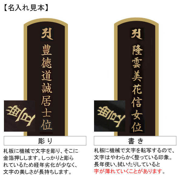 お位牌とは別に名入れの「彫り代」または「書き代」が必要です。以下よりご注文ください。