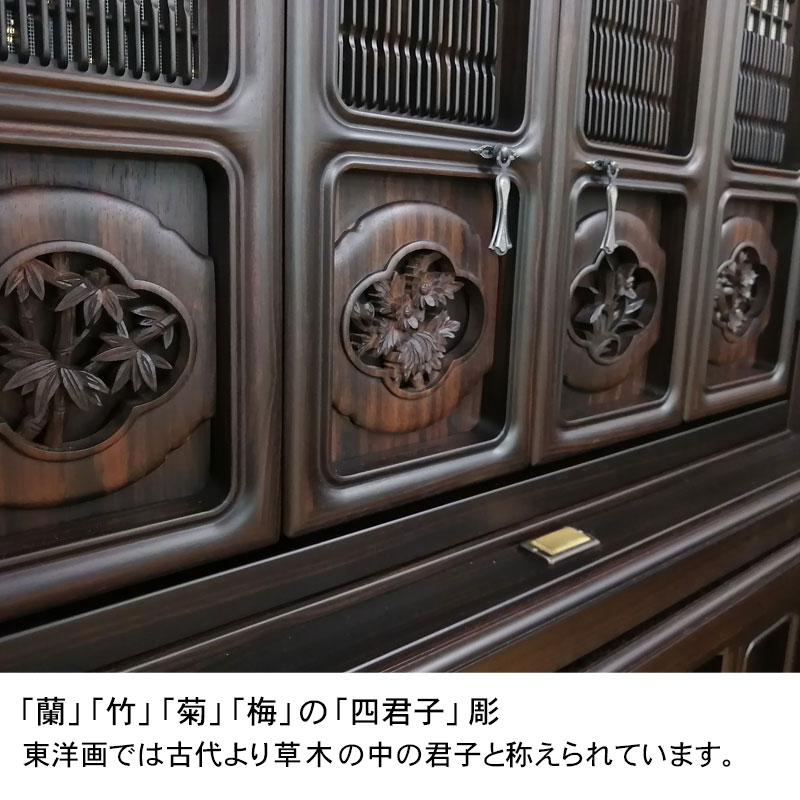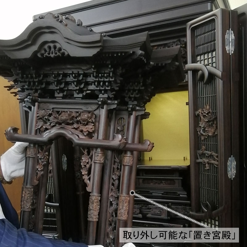 | 商品説明 | 【商品コード:3317】 ■材質詳細 ・笠、台輪/主材料:本黒檀厚板貼り 芯材料:ニヤトー ・戸板、扉/主材料:本黒檀無垢 芯材料:本黒檀無垢 ・大戸軸/主材料:本黒檀厚板貼り(四方練り) 芯材料:ニヤトー ・その他/表面仕上げ:ウレタン仕上、生産地:海外 ■宗派 どの宗派でもお使いいただけます。 ■備考 ・商品は手作りの為、一部の色、デザイン、寸法が多少変更になる場合がございます。 お仏壇の材料としては、最高級木材の本黒檀を使用した58/25号サイズのお仏壇です。 黒檀がもつ独特の縞模様が美しく、硬い木質に緻密な木肌が特徴となっております。 独立した造りの「置き宮殿」は取り外し可能で 天井部分は、折り上げ格天井に花丸彫り彩色をあしらった逸品となっております。 また、障子部分には、花車と東洋画では古代より草木の中の君子と称えられる4種の草木「蘭」「竹」「菊」「梅」の「四君子」彫が施されております。 |