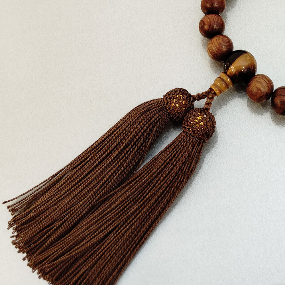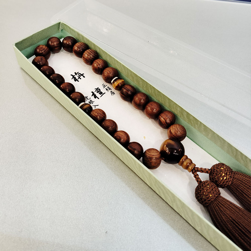 | 商品説明 | 【商品コード:3418】 ■珠の素材 ●主珠:栴檀(約13mm) ●親珠:虎眼(約16mm) ●天珠:虎眼(約10mm) ■房の素材 ●正絹房(房、通し糸共正絹) ■特徴 主珠に栴檀、親珠、天珠に虎目石を使用した男性用の数珠です。 栴檀は、淡黄褐色に茶褐色の美しい木目が特徴で、葉や木材には弱い芳香があります。 天然木ならではの使い込むごとに風合いが増し経年変色を楽しんでいただくことができます。 アクセントには、男性に人気の虎眼石を使用しております。 虎眼石は、青い石綿の繊維が層状に混入している石英で、黄褐色の光沢があり、光の反射によって縞模様が虎の眼のように見えることから、その名が付けられたとされています。 天然木の素材のよさを生かした栴檀に、虎目石を仕立てたお数珠となっております。 房には高級素材の正絹を使用しており京都の数珠職人が匠の技で仕立てた逸品でございます。 また、房の先端は、糸の先が小さなループ状に撚ってある撚房となっており、ほつれにくいつくりになっています。 数珠は、寿珠とも言われ縁起のいいプレゼントとして、成人式や就職祝いなどに贈られることが多いようです。 進物用の商品につきましては、包装をしてお届けいたします。 「志」「御祝」などの、のし紙も無料でお付けすることができます。 包装やのし紙をご希望の方は、お客様情報入力ページの「ご連絡事項」欄にご記入ください。 ■宗派 どの宗派でもお使いいただける片手略式数珠です。 ■備考 ●数珠は紙箱入り ●天然素材のため商品には若干の差があります。 |