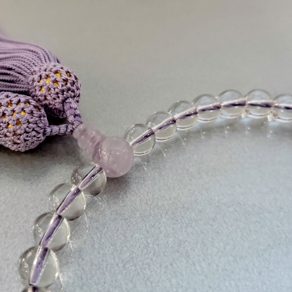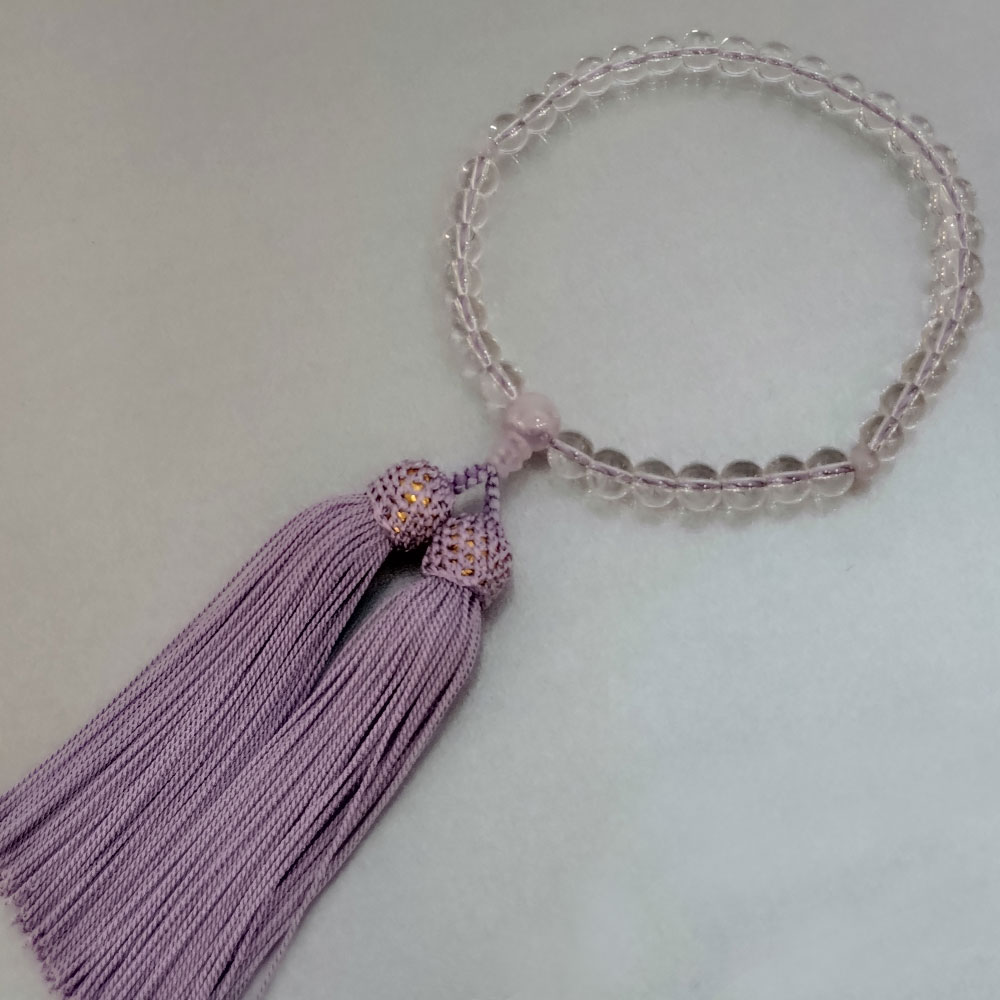 | 商品説明 | 【商品コード:3420】 ■珠の素材 ●主珠:玻璃水晶(約7mm)※玻璃(ハリ)はガラスのことです。 ●親珠:藤雲石(約10mm) ●天珠:藤雲石(約5mm) ■特徴 主珠に玻璃珠(水晶風の丸ガラス)を使用、親珠、天珠には藤雲石を使用しています。 主珠に玻璃珠を使用する事で、お求めやすい価格となっております。 藤雲石は、紫色の薄いアメジスト(紫水晶)の中で白色の雲のような模様があり、柔らかな藤色が魅力のひとつです。 藤雲石のやさしく落ち着いた色合いは、年齢を問わずご使用いただける仕上がりとなっております。 房の先端は、糸の先が小さなループ状に撚ってある撚房となっており、ほつれにくいつくりになっています。 数珠は、寿珠とも言われ縁起のいいプレゼントとして、成人式や就職祝いなどに贈られることが多いようです。 進物用の商品につきましては、包装をしてお届けいたします。 「志」「御祝」などの、のし紙も無料でお付けすることができます。 包装やのし紙をご希望の方は、お客様情報入力ページの「ご連絡事項」欄にご記入ください。 ■宗派 どの宗派でもお使いいただける片手略式数珠です。 ■備考 ●数珠は紙箱入り |
