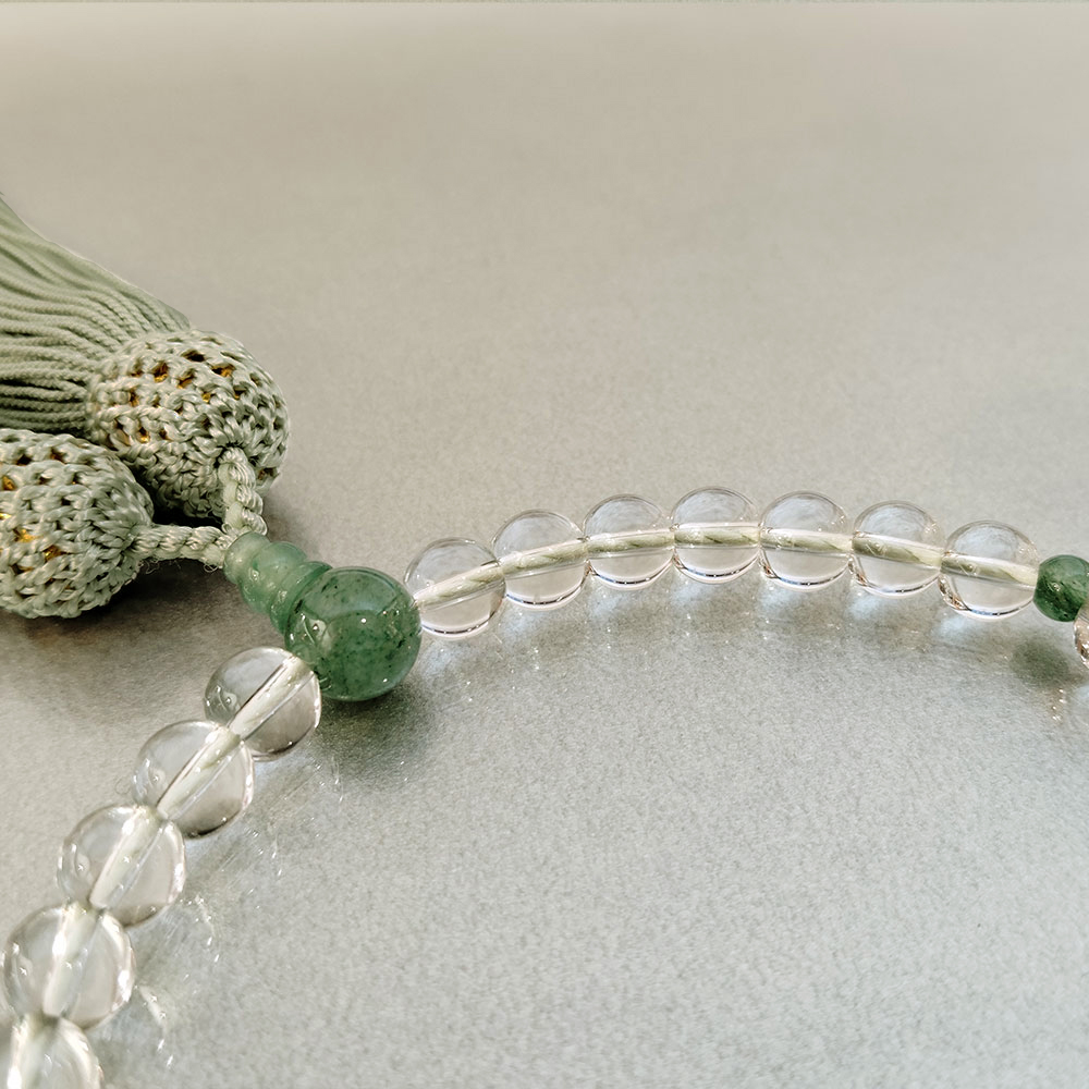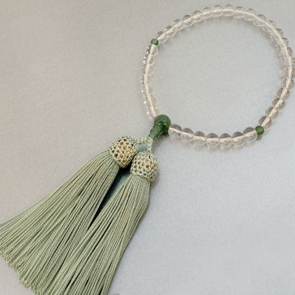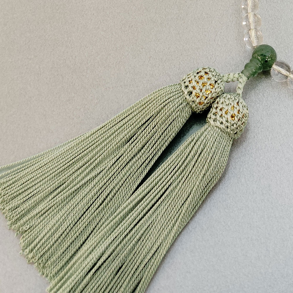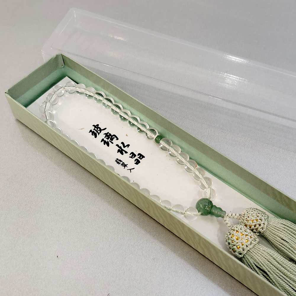 | 商品説明 | 【商品コード:3421】 ■珠の素材 ●主珠:玻璃水晶(約7mm)※玻璃(ハリ)はガラスのことです。 ●親珠:翡翠(約10mm) ●天珠:翡翠(約5mm) ■特徴 主珠に玻璃珠(水晶風の丸ガラス)を使用、親珠、天珠には翡翠を使用しています。 主珠に玻璃珠を使用する事で、お求めやすい価格となっております。 翡翠は、深緑の半透明な宝石の一つで、東洋(中国)、中南米(アステカ文明)では古くから人気が高い宝石で、その豊富な色の原石が、美しい「翡翠」(カワセミ)をイメージさせることから「翡翠玉」と呼ばれるようになり、その名前が中国から日本へと伝わってきたとされています。 翡翠の落ち着いた優しい色合いが高級感と上品さを感じさせる美しい仕上がりになっております。 房の先端は、糸の先が小さなループ状に撚ってある撚房となっており、ほつれにくいつくりになっています。 数珠は、寿珠とも言われ縁起のいいプレゼントとして、成人式や就職祝いなどに贈られることが多いようです。 進物用の商品につきましては、包装をしてお届けいたします。 「志」「御祝」などの、のし紙も無料でお付けすることができます。 包装やのし紙をご希望の方は、お客様情報入力ページの「ご連絡事項」欄にご記入ください。 ■宗派 どの宗派でもお使いいただける片手略式数珠です。 ■備考 ●数珠は紙箱入り |