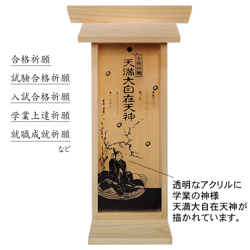 | 商品説明 | 【商品コード:3431】 ■商品詳細 ●商品サイズ:高さ 約29.4×幅 約10×奥行 約8.3cm ●札入れスペース:高さ 約22.5×幅 約8.4×奥行 約2.5cm ●原産国:日本 ●材質:国産檜材 ※写真にあるお札は付属しません。 優しい天然木の国産檜材を使用した札立用コンパクト神棚「合格社」です。 透明なアクリル板に学業の神様天満大自在天神が描かれていて、屋根部分を取り外して、お札などを入れて神棚のようにお祀りできます。 合格祈願、試験合格祈願、入試合格祈願、学業上達祈願、就職成就祈願など様々な目的でご利用いただけます。 コンパクト設計なので、棚やテーブルの上に置いたり、 背面にある穴を使って壁掛け用としてもご利用いただけます。 また、贈り物としてもお気軽にお使いいただける商品です。 【天満大自在天神とは】 天満大自在天神(てんまんだいじざいてんじん)とは、菅原道真を神格化した呼称、または神格化した道真を祀る神社を指します。道真は学問の神として広く信仰されています。? |