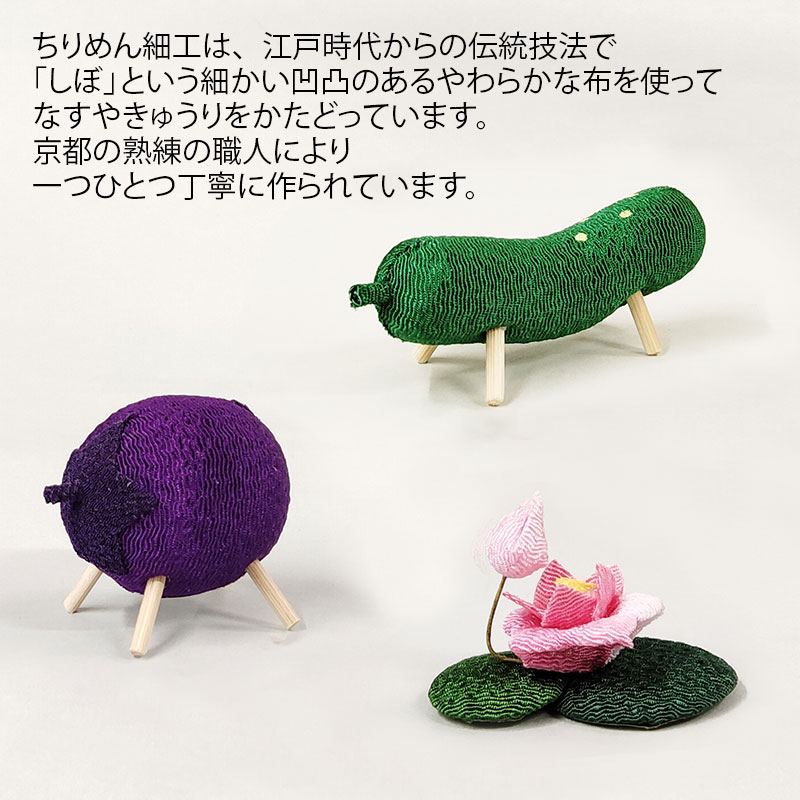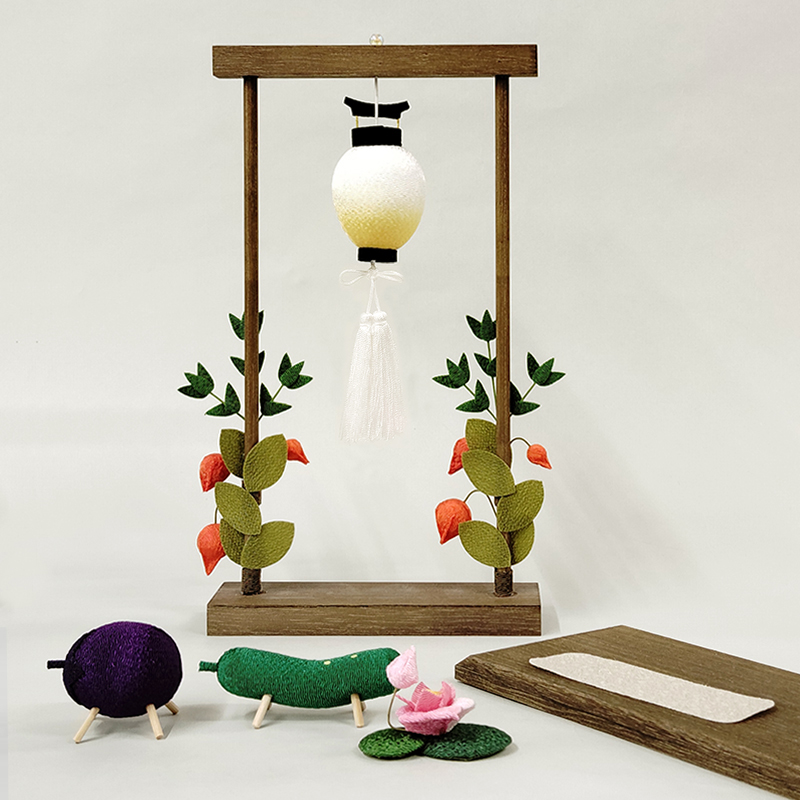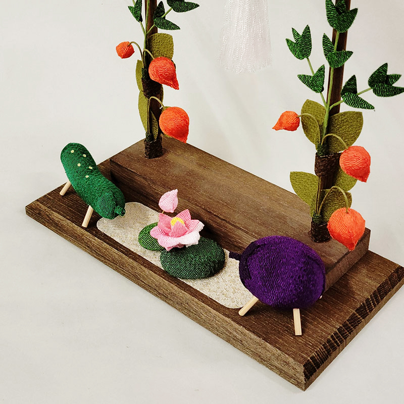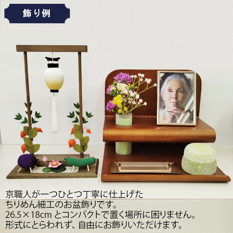 | 商品説明 | 【商品コード:3445】 ■商品詳細 ●サイズ:高さ約26.5×幅約18×奥行9cm ●素材:レーヨンちりめん他 ●日本製 ■備考: ※手作りのため生地の取り方により柄の出かたが多少変わる場合がございます。 京職人が一つひとつ丁寧に仕上げたちりめん細工のお盆飾りです。 ちりめん細工は、江戸時代からの伝統技法で「しぼ」という細かい凹凸のあるやわらかな布を使ってなすやきゅうりをかたどっています。 高さ26.5×幅18cmとコンパクトで置く場所に困りません。 形式にとらわれず、自由にお飾りいただけます。 |